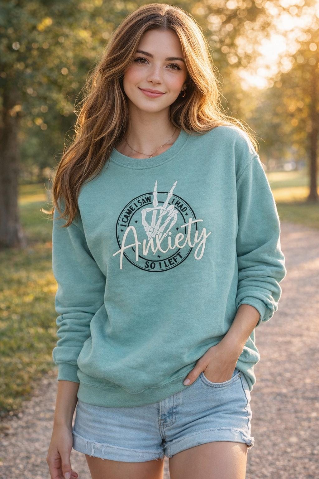 A soft 50/50 cotton-poly blend crew sweatshirt featuring the embroidered phrase: “Anxiety: I Came, I saw, I had, so I left.” A subtle, poetic expression of the inner storm—made for comfort on the outside when things feel loud inside.